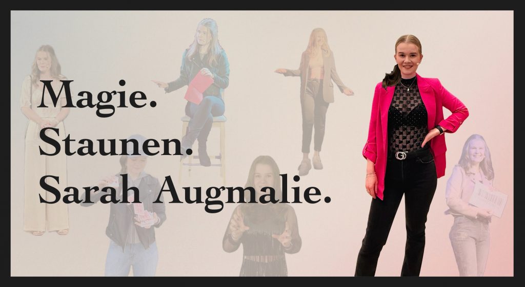 Hellooo, ich bin Sarah Augmalie, eine junge Zauberkünstlerin, Illusionistin und Mental-Magierin aus dem wunderschönen, kleinen Telgte. Seit meinem 12. Lebensjahr, ist die Zauberkunst und Magie meine Leidenschaft – angefangen vom kleinen Zauberkasten und Auftritten auf Familienfeiern, habe ich im Laufe der Jahre auch angefangen meine eigenen Zaubertricks und Illusionen zu kreieren und auf größeren Bühnen zu stehen. Auch in der Presse und im Fernsehen, beispielsweise mit und für die Ehrlich Brothers, bin ich des Öfteren vertreten.